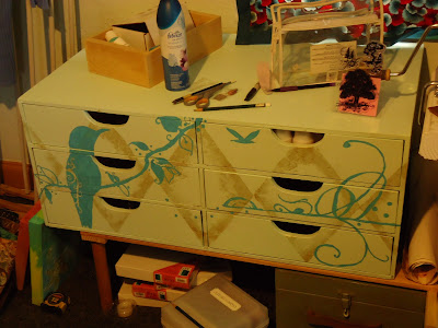 Husband cleaned out the dust and cobwebs, painted it blue to match our living room. After it dried, I added gold diamonds on it (oh, no! geometry is not my friend!), and then free-handed the bird and scroll-work.